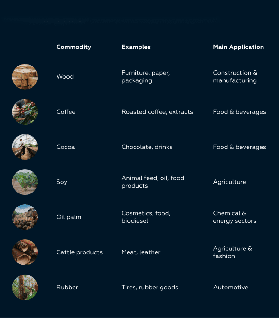 EUDR covers seven core deforestation-linked commodities: cattle, soy, palm oil, wood, coffee, cocoa, and natural rubber, as well as their derived products.