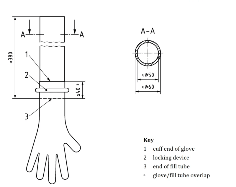 - Filling Tube Specifications: The standard mandates the use of a filling tube with precise dimensions to ensure uniform water injection. Critical dimensions (in millimeters) include a tube end diameter (marked as “≈ϕ50”) for inserting into the glove, a larger diameter section (“=ϕ60”) for stable water flow, and a minimum overlap length (“3”) between the glove and the tube (typically requiring the glove cuff to wrap around the tube securely). A locking device (“2”) is also required to fasten the glove to the tube, preventing water leakage at the connection point during testing.